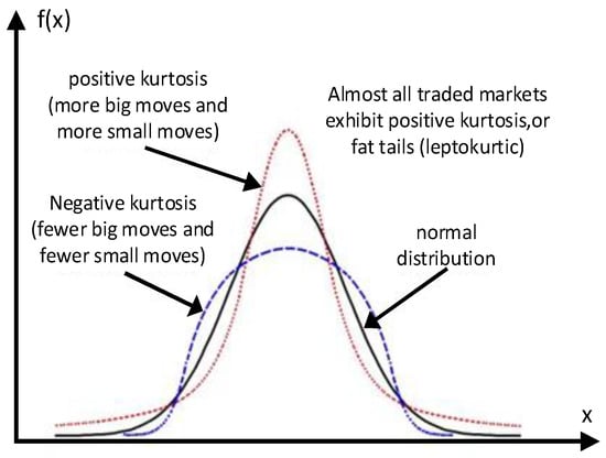 As shown in Figure 5, positive kurtosis indicates that the data are distributed near the average value, and negative kurtosis shows that the data are more dispersed and the curve shape is shorter and fatter. In mathematics, kurtosis is the ratio of the fourth-order central moment to standard deviation, and the calculation formula is as follows []: