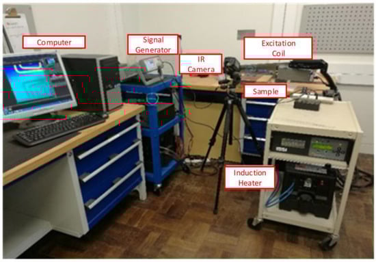 The experimental apparatus is shown in Figure 7. EasyHeat224 from Cheltenham Induction Heating provides 380Arms AC excitation current. According to previous studies, the electrical conductivity and relative permeability of steel are 4.68 × S/m and 60, while the corrosion products are close to 0.75 × S/m and 4 []. For eddy current generation, a rectangular coil is made of a 6.35 mm hollow copper tube, which connects to a water pump for cooling. The excitation frequency is set to 260 khz to generate heat on the sample surface. Based on this frequency, the initial heated region is controlled within 60. The excitation time is limited to 200 ms to avoid obvious temperature rise.