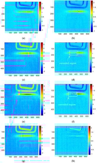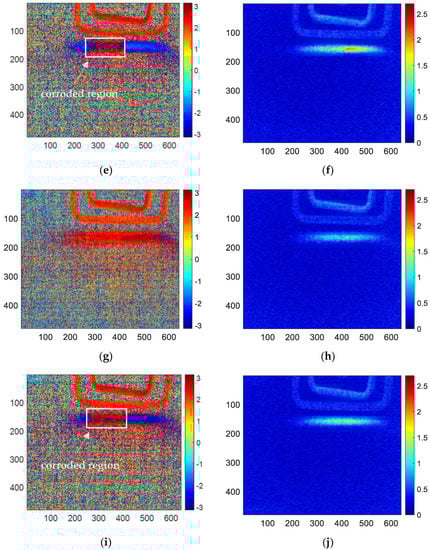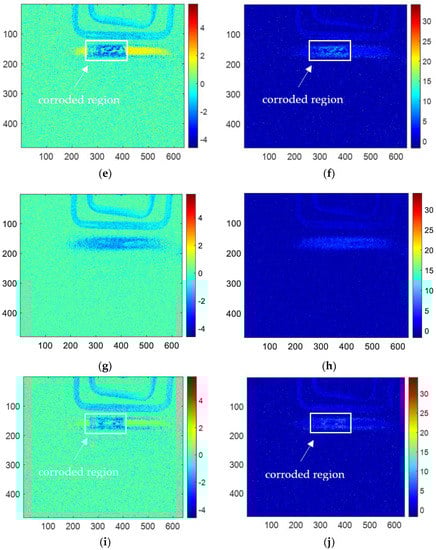 For PCA methods, the sum of contribution rates of the first and second PCs is close to 90%, which means the first two PCs contain the most information of the original thermal image sequences. Therefore, only the first two PCs are analyzed and discussed. The reconstructed images of the first and second PCs for all the samples are shown in Figure 9. In this figure, (a), (c), (e), (g), (i) are the images of the first PC, which can hardly detect the corrosion area. However, (b), (d), (f), (h), and (j) are the reconstructed images of the second PC, which can clearly characterize the shape of the corrosion. Therefore, later in this paper, only the images of the second PC of PCA will be analyzed and discussed to compare with other methods.