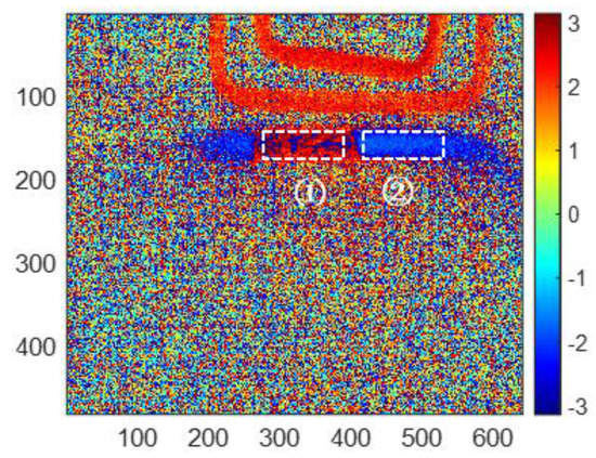 Phase frequency image of 4 Hz with FFT feature extraction. ① is the corroded region, ② is the uncorroded region.