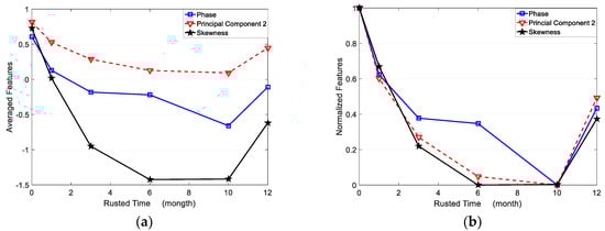 From Figure 12a, the averaged second PC has the smallest variation from the uncorroded sample to the 10-month corroded sample, while the averaged skewness has the most obvious change for the same samples. That means the skewness feature has the best sensitivity for corrosion time evaluation, especially from 0 to 6 months of corroded time. As shown in Figure 12b, the normalized three features present non-monotonic variation versus corroded time. Averaged phase and second PC features decrease from an uncorroded state to 10 months corrosion, while increasing from 10 to 12 months corroded time. Averaged skewness decreases from 0 to 6 months of corroded time, but increases from 6 to 12 months of corroded time. Therefore, the selected three features can be used to evaluate the corrosion state before 6 months of corroding time. In particular, the averaged phase and second PC can recognize the corroded time till 10 months.