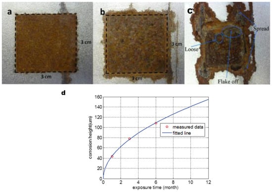 Image of corrosion state: (a) 1 month sample, (b) 6 months sample, (c) 10 months sample, and (d) heights versus exposure time [].
