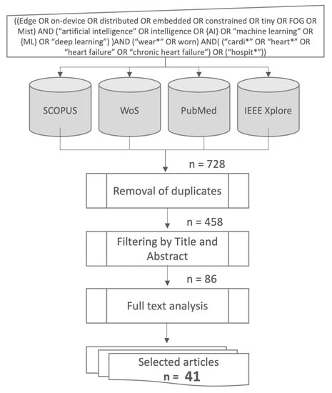 Heart failure affects approximately 26 million people worldwide and causes over 1 million hospitalizations in Europe and North America alone, causing a significant burden to healthcare systems [,,,]. Several cardiac events, including arrhythmias (abnormality in heart rhythms) and myocardial infarctions (MIs), aka (heart attacks), eventually lead to chronic heart failure (CHF). Therefore, the prevention and monitoring of these events are crucial, particularly in high-risk groups like diabetics, people with hypertension, the elderly, and obese individuals [,]. Using unobtrusive, continuous monitoring technologies can help medical professionals devise solutions to slow disease progression and prolong the lives of diagnosed CHF patients. For instance, detecting and treating Atrial Fibrillation (AFib), a common occurrence in CHF patients, can stabilize ventricular function and reduce mortality []. For this reason, much research is being directed towards developing innovative continuous monitoring technology solutions to support the diagnosis and treatment of this class of diseases and other chronic illnesses that affect a significant portion of the world’s population [,]. Various innovative technologies have been applied to the healthcare sector, promoting the development of trustworthy solutions that can provide reliable personalized care to augment the burdened healthcare systems [,]. In recent solutions, the artificial intelligence (AI) paradigm has been used to perform the accurate and intuitive analysis of health data, predict health status, and generate warnings to facilitate proactive and timely interventions [,]. Legacy AI-based solutions leverage primarily cloud-based architectures, in which data collected by wearable sensors must be transferred to a remote server for elaboration and analysis []. Such cloud-based solutions require continuous wireless data transfer using vulnerable communication channels [], which is one of the primary reasons why patients and doctors are reluctant to accept these technologies. The resulting reluctance is usually due to privacy, ease of use, perceived risk, and efficacy issues [,,,]. Therefore, the edge computing and near-sensor processing paradigms have been introduced to solve some of these issues by performing varying levels of computation, data processing, and analysis tasks closer to the data sources. In some cases, the tasks are performed directly on the devices worn by the patients, or on nearby small devices [,]. Additionally, the combination of AI and edge computing has introduced a new concept called edge intelligence [], which enables intuitive and dynamic data processing and pattern recognition very close to the data source. Adopting wearable-based edge intelligence for the prevention and management infrastructures within the chronic heart failure context can promote and guarantee efficient at-home healthcare services in emergencies []. To this aim, various works presented in the literature have investigated the main advantages of deploying edge intelligence techniques on wearable devices. However, a thorough literature search revealed the absence of a comprehensive analysis from a clinical and technology perspective, highlighting solutions applied to the CHF context and outlining their effect on patients, medical professionals, and other concerned parties.