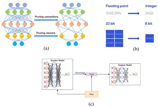Model compression methods: (a) pruning, (b) quantization, and (c) knowledge distillation [,,].