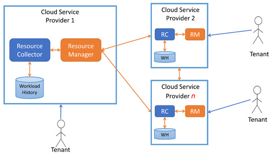 As shown in Figure 1, there will be multiple CSPs. In our case, we will be working with a federation of 3 CSPs. Each CSP has an RM unit that hosts the components of the FEDQWP including the Deep Reinforcement Learning (DRL) agents along with the resource scaling functionalities. The Resource Collector (RC) interfaces with the manager to collect the workload history and store it for future use. We assume that: