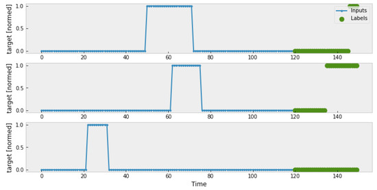 The next step is to define the input sequence and forecasting sequence, which is named Time Window. As shown in Figure 4, the window size is set to be 120 , the forecasting sequence is 30 . The input historical observations are marked by blue points, the practical labels are marked by green points. And every time one round of prediction is finished, the time window slides forward for 30 , until all timestamps are forecast.