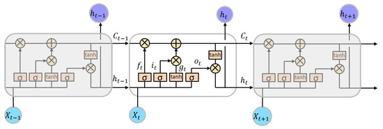 The internal structure of LSTM and the connections are presented in Figure 10, where means the input of feature matrix at current moment; similarly, and are inputs at the last and the next moment. The hidden layer outputs are represented by , , and . is the internal memory state of the module which is called the cell state. Normally, LSTM modules are connected in a form of chains. It consists of a forget gate, an update gate, and an output gate.