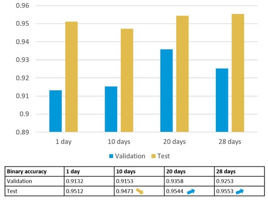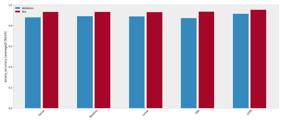 The binary accuracy of these five machine learning models is depicted in Figure 11, where the validation accuracy is marked by a blue bar, while the red bar represents the test accuracy. Though all models have similar forecasting ability, only the ones performing better than benchmark models should draw attention.