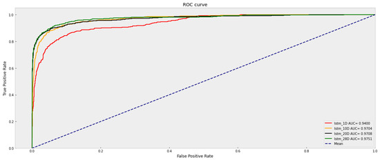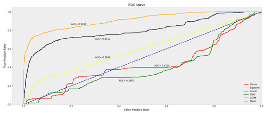 In order to further analyze the diagnostic ability of a binary classifier system when the discrimination threshold varies, a receiver operating characteristic (ROC) curve is adopted. As shown in Figure 12, the ROC curve is created by plotting TPR against FPR as various threshold settings. The Area under the Curve (AUC) is further calculated to evaluate the classification ability. When the AUC score is 0.5, it means a totally random prediction, while a perfect classifier has one as the AUC score. It is more intuitive to find that LSTM performs the best compared with other models.