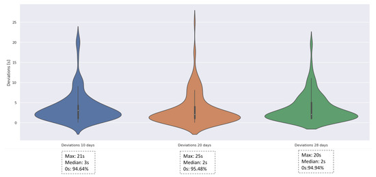 Since these machine learning models are applied for traffic signal prediction, one of the most vital evaluation indicators is the time deviation. Even an error of a few seconds can probably cause a serious traffic accident, especially at the moment of signal changes. Therefore, the deviations of the LSTM model trained by data of 10 days, 20 days, and 28 days are calculated for comparison. As shown in Figure 14, the violin plot can describe the distribution of deviations. The flatter the shape of the violin plot and the lower the median, the more concentrated and lower the deviations. The reason that the maximum deviation is approximate 20 is that the model probably misses one GREEN signal, since it is really hard to guarantee the trained LSTM can catch each future signal changes with a 100% accuracy. However, the median of deviations is approximately 2 , which means if the deviations exist, 50% of them are below 2 . Even though the deviations cannot be avoided, about 95% of forecasting signals have no deviations. From a general perspective, there is a slight tendency that the longer horizon of the training data, the better the forecasting quality.