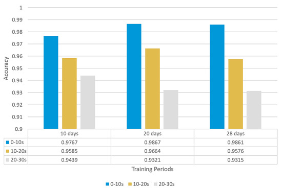 Because of the excellent forecasting performance of LSTM based on one-day data, a further training with one-month data of February follows. Rather than direct training with one-month data, the data sheet is divided into three groups to observe the accuracy changes in detail. After calculation, the training results of 1 day, 10 days, 20 days, and 28 days are depicted in Figure 13. It is interesting to find that the test accuracy reduces a little bit when the data horizon is extended from 1 day to 10 days. This could be caused when the model is trained well for one-day data (e.g., workday), but it may not predict well for another day (e.g., weekend). Nevertheless, as the data cover more time horizons, the corresponding general predicting accuracy increases. But the accuracy of one month is not improved significantly.
