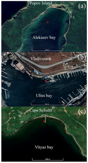 The instrument installation locations (red dot) in Alekseev bay (a), Uliss bay (b) and Vityaz bay (c).