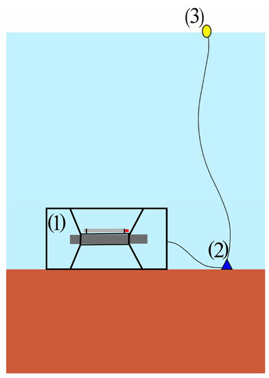 The supersensitive detector of hydrosphere pressure variations, with the Valeport Mini SVP sound velocity profiler attached to it, was installed on the bottom. In all three experiments, the installation scheme was the same, as shown in Figure 3. The instruments in a protective cage (1) were installed horizontally on the bottom. The protective cage prevents the instruments from sinking into the mud or sand on the bottom. Then a weight (2) was fixed to the protective cage, and a signal buoy (3) was lowered to the bottom. The use of weight is necessary to exclude the influence of surface sea waves on instrument readings. The oscillations transmitted from the signal buoy along the rope are damped by the weight. This arrangement of instruments makes it easy to lower and lift the instruments and to determine the installation location by the signal buoy.