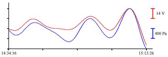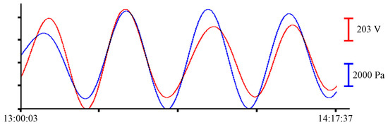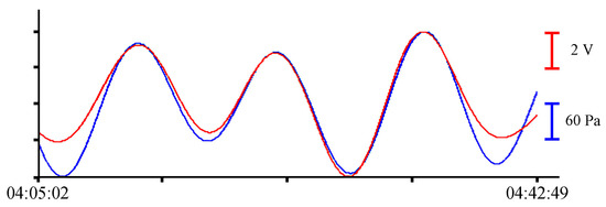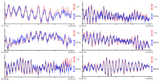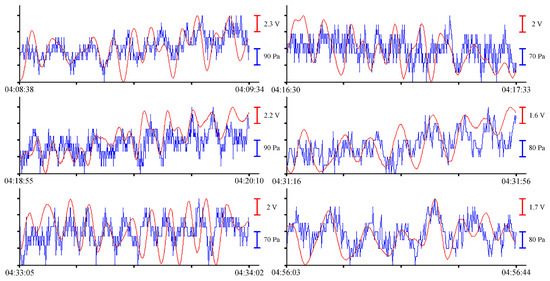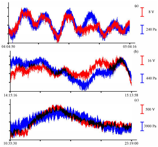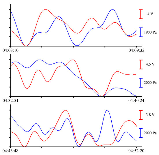Oscillations with periods of about 10.5 min, corresponding to eigen oscillations of Alekseev Bay, were singled out in the filtered record of the instruments [25]. In Figure 6, Figure 7, Figure 8 and Figure 9, the record from the pressure sensor of the Valeport Mini SVP Sound velocity profiler is shown in blue, and the record from the supersensitive detector of hydrosphere pressure variations is shown in red. The x-axis scales are shown on the right of each curve with the corresponding color.