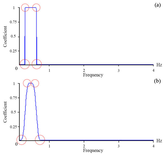 To single out lower-frequency oscillations, a band-pass filter with a Hamming window [24] will be applied. To select oscillations with periods from 8 s (0.125 Hz) to 5 min (0.003 Hz), the window length will be 4000, and to select oscillations with long periods, from 8 min (2 MHz) to 20 min (0.8 MHz), the window length will be 15,000. The choice of such window lengths is related to the frequency of the original signal and the shape of the filter. Figure 5 shows the forms of the amplitude-frequency response of the filter with window lengths of 4000 (a) and 100 (b). We can see from the figure that, with a greater length, its boundaries are sharper. This allows us to select a narrower filter band and eliminate unwanted frequencies. The use of a 15,000-length filter for lower-frequency oscillations is determined by the frequency of the original signal. At the frequency of 8 Hz (8 measurements per 1 s), for oscillations with periods of 20 min, there will be 9600 measurements. For such periods, the window length of 4000 will not be sufficient for accurate filtering.