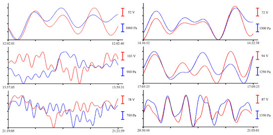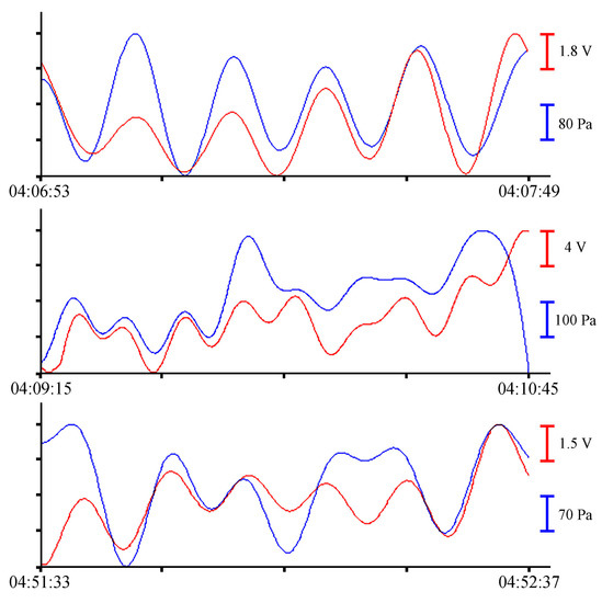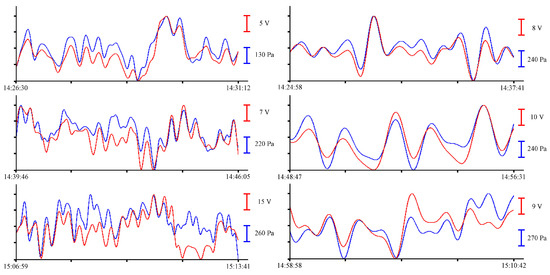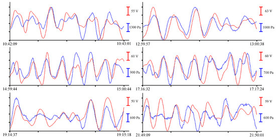 In the summer of 2022, a similar experiment with the installation of these instruments was held in the south of the Primorsky Territory, in Vityaz Bay. This time, the instruments were installed at a depth of 5 m. As a result of preprocessing, a synchronous record was obtained for more than 12 h. Let us select several fragments of the records of the supersensitive detector of hydrosphere pressure variations and the pressure sensor of the Valeport Mini SVP sound velocity profiler to estimate the amplitudes of wind waves. In Figure 13, synchronous fragments of the instruments’ records are shown as an example.