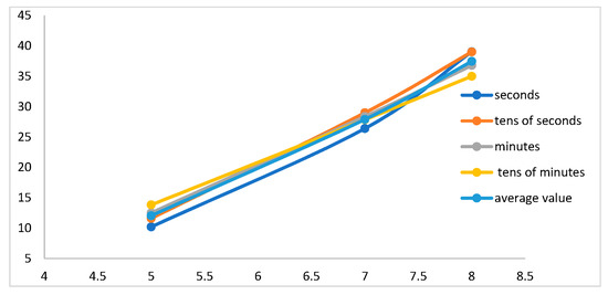 Let us calculate the data conversion coefficient of the supersensitive detector of hydrosphere pressure variations from the data given in the tables. To do this, we calculate the values of the average coefficient for each type of wave. Thus, for wind waves, when the instruments were installed at a depth of 5 m, the average value was 9.8 Pa/V, and when the instrument was placed at a depth of 7 m, the average value of the coefficient was 26.4 Pa/V. An increase in this value is also observed with an increase in the immersion depth; at the depth of 8 m, it was 38.8 Pa/V. When we considered the amplitudes of sea waves with periods from 10 to 25 s, the value of the conversion coefficient also increased with increasing immersion depth. For the depth of 5 m, it was 12 Pa/V, at the depth of 7 m, the value was 28.9 Pa/V and when the instruments were immersed to the depth of 8 m, this coefficient was 39.8 Pa/V. A similar situation is observed when analyzing the values of the ratio of the amplitudes of infragravity waves. The average value of the data conversion factor for depths of 5, 7, and 8 m is 12.5, 28.3, and 36.9 Pa/V, respectively. Waves with periods ranging from 9 to 20 min are no exception. When calculating the average values of the ratio of the amplitudes of these waves, an increase in the coefficient with increasing depth is also observed. When the instruments were immersed to a depth of 5 m, the coefficient was 12 Pa/V, and at depths of 7 and 8 m, the coefficient was 28.8 Pa/V and 36 Pa/V. Figure 16 shows the dependence of the average value of the data conversion coefficient of the supersensitive detector of hydrosphere pressure variations on the depth of immersion for each type of sea wave.