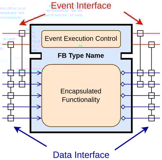 Figure 1 depicts an FB in the context of IEC-61499. The FB encapsulates the desired functionality, but unlike the FBs in IEC-61131-3, it distinguishes between events and data, where events trigger the functionalities of the FBs. Each event input is connected to several data inputs, and each event output is connected to several data outputs. The behavior of the FB is governed by the Event Execution Control (ECC), which functions as a state machine that responds to input events.