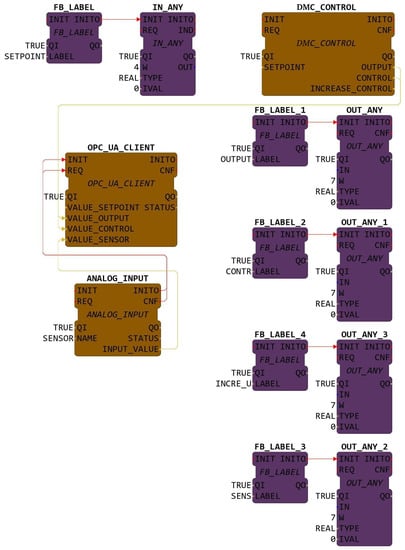 The integration of MPCs into the FBs of the IEC-61499 standard introduces powerful control capabilities within the distributed application model. MPC, a robust control strategy, enables the prediction of system behavior based on dynamic models and optimization algorithms [32]. By incorporating MPCs into FBs, the IEC-61499 standard empowers control engineers to develop advanced control solutions that can handle complex process dynamics and optimize system performance. The Function Blocks act as modular components that encapsulate the MPC algorithms, enabling their seamless integration into the distributed application architecture [33]. This integration facilitates the deployment of MPC-based control strategies across multiple devices, providing a distributed control system capable of real-time optimization and adaptive control. With the incorporation of MPC into Function Blocks, the IEC-61499 standard enhances the capabilities of automation and control systems, enabling more efficient and intelligent management of processes across diverse industries.