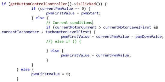 The C++ code utilizes the data obtained from the telemetric system, including the RPM and current measurements, to calculate and update the PWM value in real time. On the basis of the acquired RPM and current values, the code calculates the desired PWM value. This calculation can be customized based on the specific control algorithm and optimization strategy used. The calculated PWM value is then sent to the motor controller to update the PWM signal. This ensures that the motor receives the appropriate power input based on the current operating conditions. The code snippet presented in Figure 3 below provides a basic foundation for dynamic PWM control based on the RPM and current measurements. However, it is important to note that the actual implementation may vary depending on the specific requirements of the motor and the control strategy used.