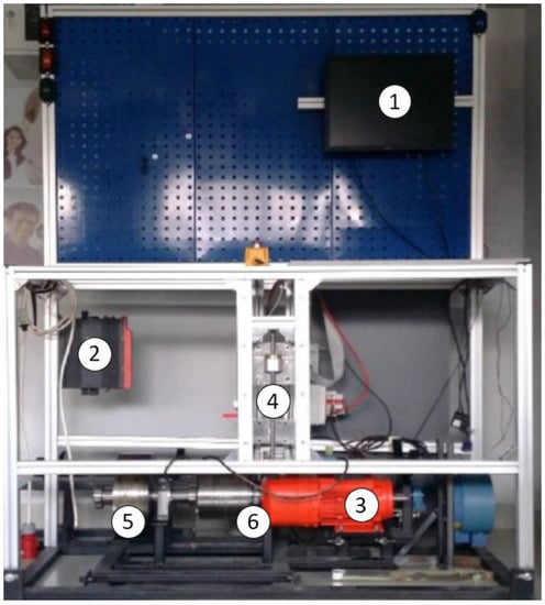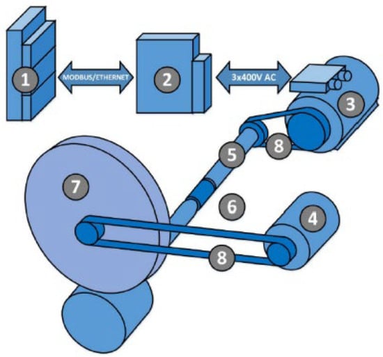 The SEW drive utilized in the measuring station offered a reliable and accurate method of quantifying the torque generated by the DC motor. By measuring the torque, it was possible to assess the motor’s output power and its ability to drive various loads. A view of the SEW drive dyno test stand is presented in Figure 5 below. The numbers in the picture correspond to the elements of the test stand listed in the previous section. The vehicle wheel and toothed belts are not presented in the picture.