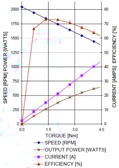 The data collected were subsequently processed and analyzed using statistical and graphical tools. These findings served as a basis for evaluating the controller’s efficiency in optimizing energy consumption and its ability to adapt to varying load demands. It should be noted that this specific DC motor has the highest efficiency at approximately 1800 RPM, as presented in Figure 7.