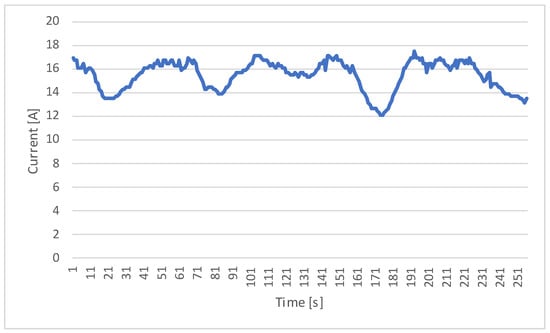 Figure 8 illustrates the trend in the current values over time, showcasing the dynamic behavior of the motor’s power consumption. The current values range from 12 to 18 amps, demonstrating the varying load demands experienced by the motor during the experimental trials.