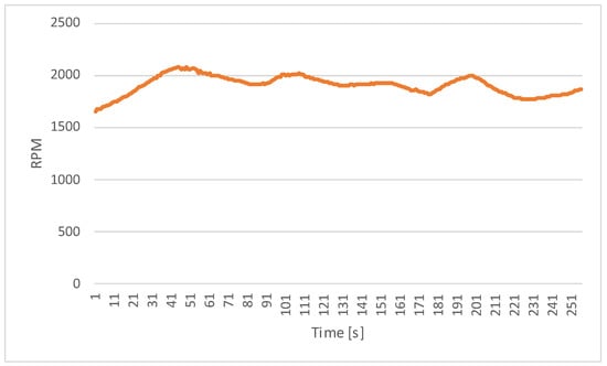 Figure 9 displays the RPM values over time, highlighting the motor speed variations throughout the experimental trials. The RPM values range from 1650 to 2100, reflecting the motor’s ability to adjust its rotational speed to effectively meet the load demands.