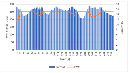 The purpose of the present study was to enable the PWM signal controlling the motor to be dynamically varied in fill, based on measured values in real time. Figure 10 illustrates the relationship between the current and the PWM signal over time, allowing for a comprehensive analysis of the motor behavior under different load conditions.