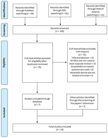 A total of 100 papers was found by searching the listed databases. Screening of the selected articles’ references identified seven other papers. A total of 14 articles was included in this systematic review (Figure 1). Details of the selected papers are summarized in Table 1 and Table 2. Only studies reporting quantitative results on scapular kinematics are included in Table 2 [36,37,38,41,42,43,44,45,46,47,48].