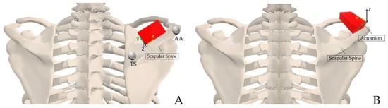 Scapular M-IMU (in red) positioning technique (unilateral case): M-IMU was placed over the central third between the angulus acromialis (AA) and the trigonum spinae (TS) aligning the x-axis of the sensor with the cranial edge of the scapular spine (A); M-IMU was positioned on the flat surface of the acromion with the x-axis perpendicular to the scapular spine (B).