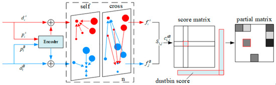According to the order of the descriptor and the detector, local feature matching can be divided into detect-then-describe [20,21], detect-and-describe [22], and describe-to-detect [23,24]. Detect-then-describe feature matching is always performed by: (i) detecting feature points, (ii) computing visual descriptors, (iii) matching these with a Nearest Neighbor (NN) search, (iv) filtering mismatches, and (v) calculating a geometric transformation. The classical pipeline developed in the 2000s is often based on SIFT, filter match pairs with Lowe’s ratio test, and calculates a transformation and rotation with a robust solver like RANSAC.