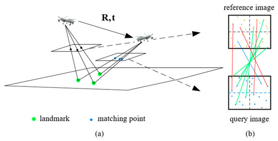 Based on the first two steps, UAV can match the query image U with the most relevant image R using the method proposed above. As shown in Figure 5a, we assume a feature point in the reference image is matched to the feature point in the query image. According to the landmark vector, this match corresponds to a 3D point P in the object space. Hence, we calculate the 6-DOF pose via the DLT algorithm.