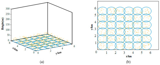 Before the positioning experiment via the vision sensor, we need to construct the cognitive map of the simulation environment. The UAV explored the whole scene and generated 36 place cells with the correspondent feature points and reference images. After that, we calculate the global coordinate of the feature points. Ideally, the place cell firing field is circular. As shown in Figure 6, some of the 3D feature points and circles are drawn in the global coordinate. We use blue circles to represent the firing field. All feature points in each circle are attached to the corresponding place cell. Based on the cognitive map, only one place cell will be activated, while the UAV is in somewhere. As a result, we can obtain an initial position to calculate the accurate value later.