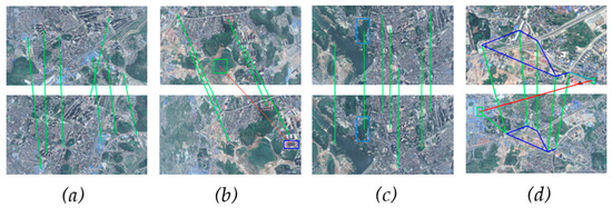 The results of the proposed matching methods. In the figure, the green line shows the matches that are accurate. The red lines represent mismatches. Different color squares represent different target types. In (a,c), both SuperGlue and proposed method perform well. In (b), green box and blue box mean different semantics. In (d), the color lines mean the relations of the feature pionts are in the same image.
