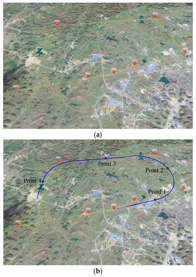 Planning and real trajectory of UAV in the simulation platform. (a) The planning trajectory of UAV in the simulation platform. (b) The real trajectory of UAV in the simulation platform.