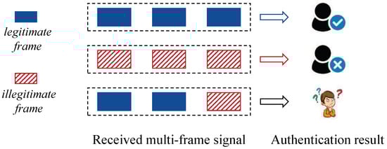 where represents the weight of different feature estimates, and represents the decision threshold. If is accepted, it implies that the received multi-frame signal originates from Alice. Conversely, if is accepted, it indicates that the received multi-frame signal originates from Eve, thus implying an impersonation attack.