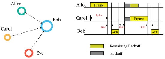 We consider the communication model depicted in Figure 2, where Alice and Carol act as transmitters, while Bob acts as the receiver. In this model, both Alice and Carol utilize the CSMA/CA protocol to access the channel. Bob responds with an ACK frame when he has successfully received a frame. Additionally present in the communication model is an impersonation attacker named Eve. Eve possesses knowledge about Alice, including her MAC address, IP address, and communication protocol. Eve’s objective is to transmit forged frames by impersonating Alice, with the intention of pursuing invalid interests.