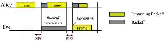 Arbitrary injection of a forged frame into valid traffic by Eve through modifying the Backoff time.
