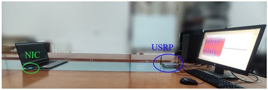 To demonstrate the impact of the aforementioned forged frame injection on the MFS-based RFFA, we conducted a Proof-of-Concept experiment to measure the averaged feature estimate with multiple frames in the presence and absence of the aforementioned injection. For this purpose, we first developed a frame signal collection platform, as shown in Figure 4, in which we utilized a universal software radio peripheral (USRP) as the receiver to collect frames signal by setting the Network Interface Card (NIC) as the transmitter. Next, frame signals from two NICs, which represent Alice and Eve, were alternately sampled. We estimated, normalized, and recorded the CFO for each collected frame. Subsequently, we combined these CFO estimates to form a group of M samples comprising elements randomly originating from Eve and the remaining elements randomly originating from Alice. We then calculated the average CFO estimate for each group type by setting .