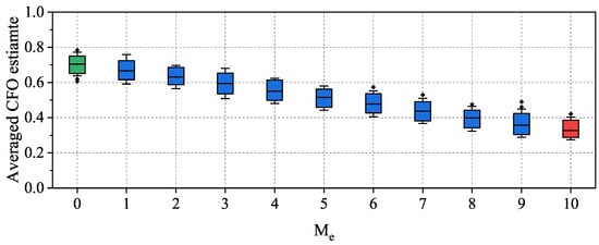 To analyze the statistical distribution in the averaged CFO estimate, we set , and varied from 0 to 10 to form 11 group classes. For each group class, we generated samples, calculated the corresponding averaged CFO estimate of each sample, and used box plots, as illustrated in Figure 5, to represent the statistical characteristics of the averaged CFO estimate. The results in Figure 5 show that the averaged CFO estimate for classes and (green and red) exhibited the largest distinction, indicating that, if we can ensure all of the 10 frames originate from the same transmitter, the MFS-based RFFA can achieve the highest accuracy. However, as decreased from nine to one, the distribution of the averaged CFO estimate gradually became more and more similar to that of . In particular, when , more than half of the averaged CFO estimate overlapped with that of . This suggests that, when Eve injects only one forged frame into valid traffic, the forged frame is much more likely to be accepted by the MFS-based RFFA. Overall, the results presented in Figure 5 demonstrate the severity of the identified injection attack in the MFS-based RFFA.