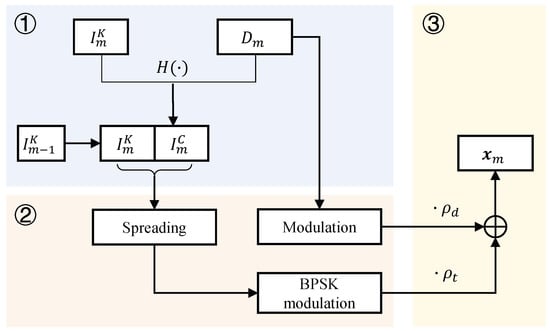 First, we generate the unique information that needs to be attached in each transmitted frame signal. Let us denote the message data of the m-th frame by , where m is interpreted as the frame index. It is worth noting that the re-transmitted frame is considered to have the same index m. Then, we can denote the unique information of the m-th frame by . Here, satisfies