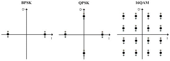 Since the designed IfrPS requires a portion of transmission power to convey the unique information, the message demodulation BER will inevitably be affected. We measured the efficiency of the IfrPS design by evaluating its impact on message demodulation error. To this end, we considered the BPSK, QPSK, and 16QAM, with the constellation with IfrPS design shown in Figure 9, and performed both theoretical analysis and numerical evaluation towards these three modulation systems to assess the efficiency of the IfrPS design.