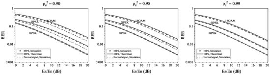 We present both theoretical and numerical results for the message demodulation BER of IfrPS in the presence of BPSK, QPSK, and 16QAM modulations, as well as the BER of the normal signal (without IfrPS), for comparison. Figure 10 illustrates these results.