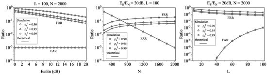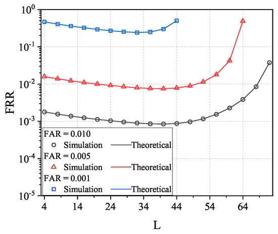 To prove the feasibility of using the above method for optimizing L and, thus, to reduce the FRR under the same FAR levels, we illustrate in Figure 14 the obtained FRR by searching the optimal L. Note that the optimal L is numerically searched using the FRR and FAR expressions in Equations (20) and (21). The first observation from Figure 14 is that the searched L is the optimal one since it leads to the minimal FRR for both the theoretical and numerical results. The second observation is that the relationship between FRR and L is the convex function and, thus, we can always search the optimal L.