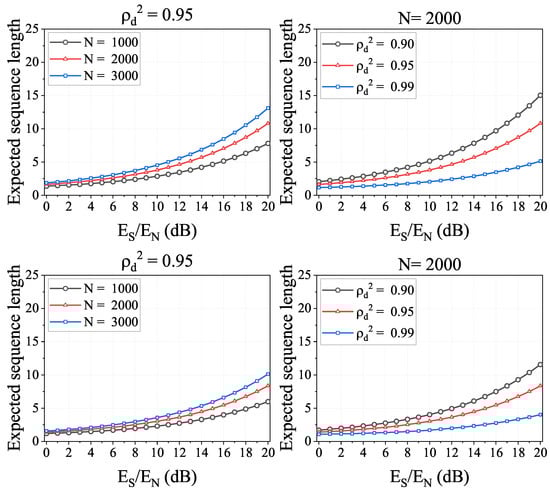 Simulation results of expected sequence length. Tested under the FAR of IfrPS set to be (the top figures), (the middle figures) and (the bottom figures).