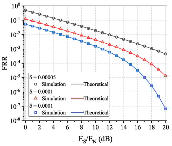 Theoretical and simulated FRR in the IfrPS-based multi-frame signal-based RFFA, with different FAR values. Tested under , .