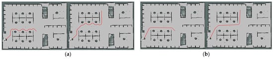 As shown in Figure 2, the two paths in Figure 2a are the original results generated by A* algorithm, and the two paths in Figure 2b are the optimized paths. It is obvious that the number of curves in each path decreased after optimization. Moreover, the shape of the path generated by the optimized A* algorithm is much more suitable for the mobile base to track with the local planner which will be introduced later.