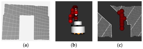 At first, we validated the effectiveness of the configuration-generating part of our method which is routine PLANMANIPPATH(), since routine GENERATEMANIPPATH() was simple, we ran sampling-based heuristic method and random sampling method of generating collision-free configuration in four different scenarios in simulation and compared the outcomes. In both methods, routine MANIPCOLLISIONFREE() was used to check whether the configuration is collision-free with the environment. In addition, self-collision checking is added to both methods to avoid possible self-collision of the manipulator. Similar to routine MANIPCOLLISIONFREE(), here bounding balls are used to represent the volume of the manipulator, and the collision checking between bounding balls is performed in 3D with the same method as described in routine MANIPCOLLISIONFREE(). The simulation environment corresponding to each scenario is shown in Figure 7, column (b) while the point cloud used in the collision checking is shown in column (a). The mobile manipulator was placed in front of each obstacle and the configuration-generating algorithm was run. We compared the sampling-base heuristic method with the random sampling method on the basis of three criteria: (a) number of sampling times, (b) sampling time, (c) percentage of successful attempts, and the results are presented in Table 1.