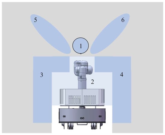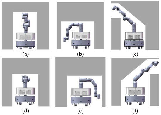 As shown in Figure 5, area 2 must be free otherwise the base of the manipulator cannot change its configuration at all. If this area is occupied, would be returned. If possible, the configuration using area 2 and 1 should be chosen first, which corresponds to Figure 4a, because it is the normal configuration for the manipulator and has the best stability among all configurations in templates. The situation of area 1 should be checked first. If area 1 is occupied, the situation of area 3 and area 4 is checked at the same time. The configuration corresponding to area 3 and area 4 are shown in Figure 4b,e. The configuration corresponding to areas 5 and 6 are shown in Figure 4c,f, The center of gravity in Figure 4b,e are closer to the center of the mobile base than that in Figure 4c,f. Of course, if area 3 and area 4 are both unavailable, area 5 and area 6 are checked. If both area 5 and area 6 are occupied, the robot has only one choice as shown in Figure 4d. After analyzing all areas, a template that is most similar to the environment would be selected. It is also possible that all areas are occupied, in which case is returned. After finding the most similar template, all joint angles of the corresponding configuration are known.